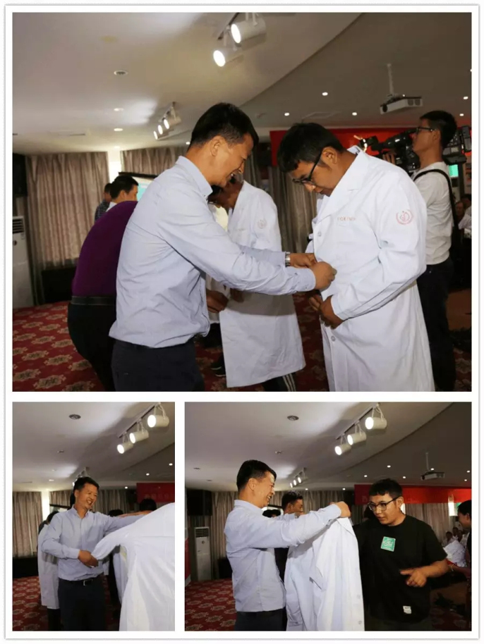 會議舉行了換裝儀式。王斌、陳彬、孫貴林、李君、李勇、何靜等院領導為醫(yī)師代表換上整潔的新式白大褂,向醫(yī)師代表贈送了首屆醫(yī)師節(jié)紀念禮物;汪麗、李勇、徐勝柱、扇敏娜、李生隆等一起為全體醫(yī)師分發(fā)慶祝蛋糕,讓每一位在場醫(yī)務人員品嘗到濃濃的節(jié)日甜蜜。