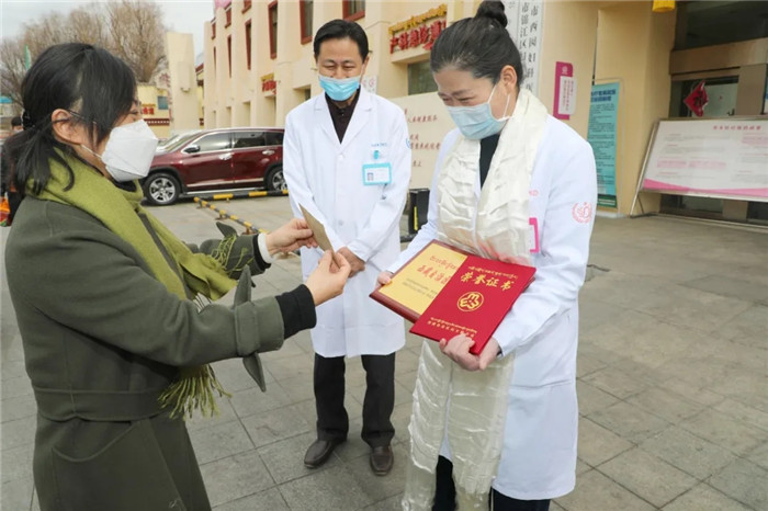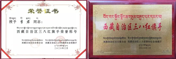 由于目前處于新冠肺炎疫情期間,兩位領(lǐng)導(dǎo)親自將此次榮譽(yù)送到阜康,雖然表彰儀式簡單,但卻意義非凡。西藏自治區(qū)人力資源和社會(huì)保障廳巡視員劉莉?yàn)槔罹洪L獻(xiàn)上了潔白的哈達(dá)和"西藏自治區(qū)三八紅旗手”榮譽(yù)證書及獎(jiǎng)牌,并勉勵(lì)道: