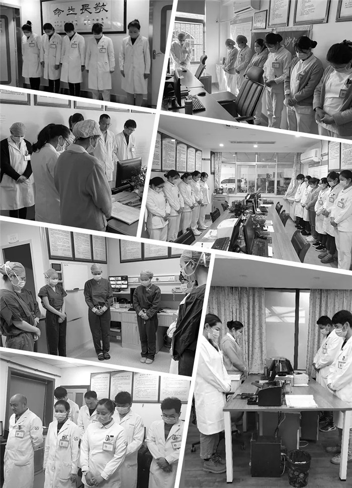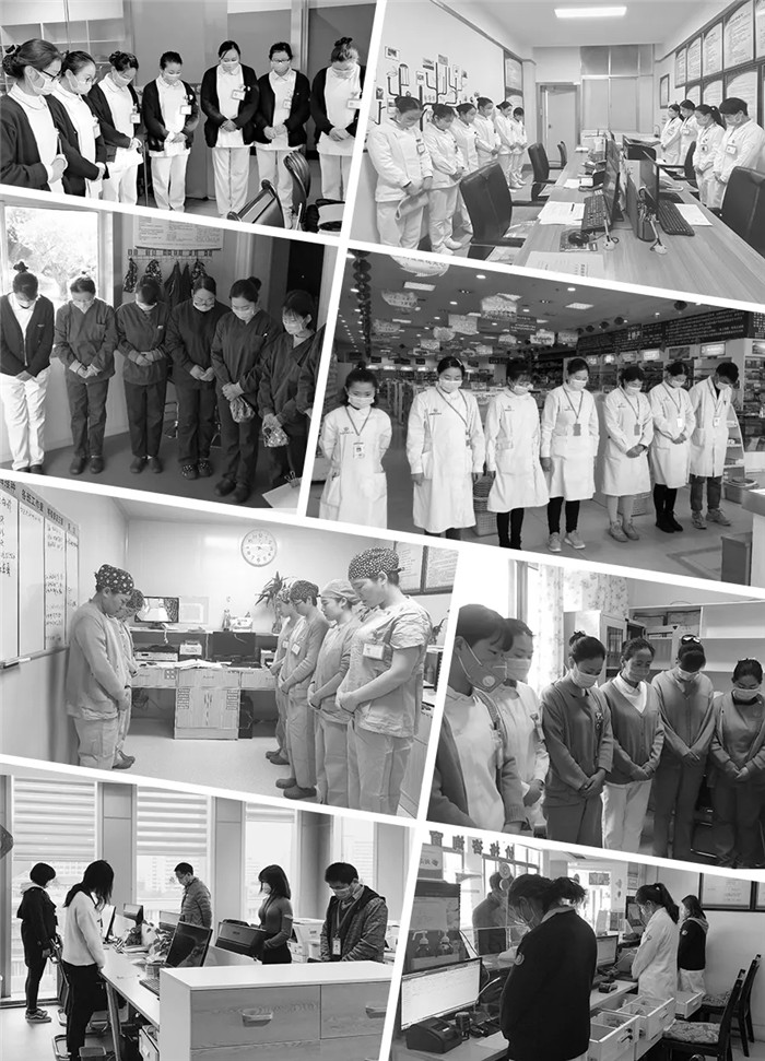 上午10點,隨著防空警報拉響,阜康醫(yī)療全體黨員和醫(yī)務工作者、行后人員分別在阜康醫(yī)院各院區(qū)、各科室、各藥房肅穆站立、低頭默哀。在這次疫情的特殊期間,有些人倒下了,但更多的人勇敢地扛起責任,在黨中央的堅強領導下和疫情頑強斗爭,如今我們已經基本控制這場斗爭的局面,正在向全面勝利努力奮進。