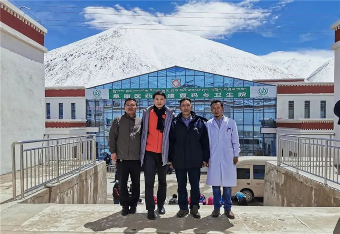 左起:夏瑪鄉(xiāng)鄉(xiāng)長李智安,阜康醫(yī)院王斌董事長,阜康醫(yī)院名譽院長嘎布,鄉(xiāng)衛(wèi)生院院長東知塵措合影