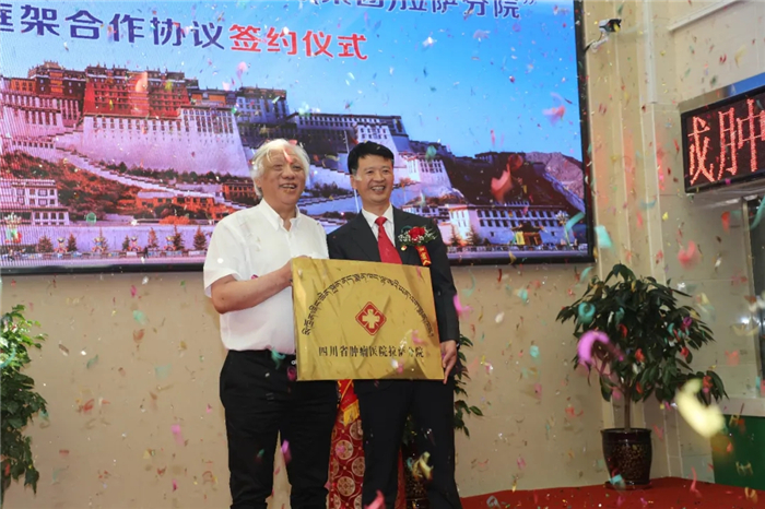四川省腫瘤醫(yī)院黨委書記郎錦義,西藏阜康醫(yī)療股份有限公司黨委書記、董事長王斌代表雙方共同簽署《川藏區(qū)域共建四川省腫瘤醫(yī)院(集團)拉薩分院戰(zhàn)略框架合作協(xié)議》,隨后郎錦義書記向王斌董事長進行了授牌。