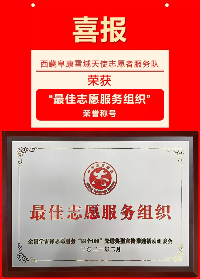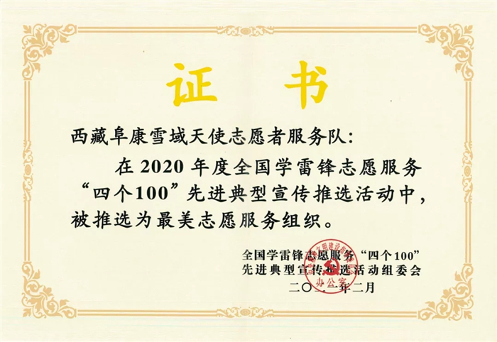 在2020年度全國學(xué)雷鋒志愿服務(wù)"四個100”先進典型宣傳推選活動中,西藏阜康雪域天使志愿者服務(wù)隊榮獲"最佳志愿服務(wù)組織”榮譽稱號。