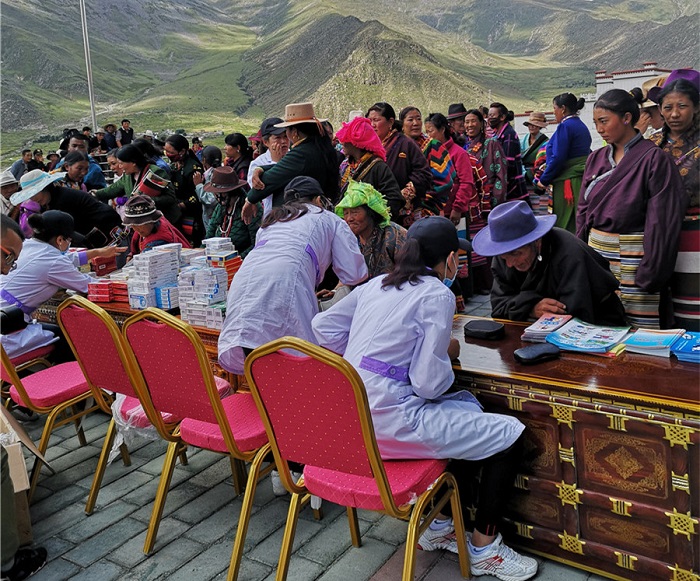 當(dāng)天上午,全國婦聯(lián)宣傳部、自治區(qū)婦聯(lián)、拉薩市婦聯(lián)、那曲市婦聯(lián)一行來到安置點(diǎn)為群眾贈送了藏漢雙語書籍。阜康義診工作隊(duì)也來到現(xiàn)場為安置點(diǎn)居民量血壓、檢查病情并詢問身體情況,耐心細(xì)致地為群眾分析病情、講解日常衛(wèi)生保健、合理用藥等衛(wèi)生常識,認(rèn)真解答關(guān)于常見病、多發(fā)病的預(yù)防診治及愈后注意事項(xiàng)。僅一個上午時間就為100余名安置點(diǎn)群眾開展了問診、聽診、答疑、測血壓和健康知識宣傳,免費(fèi)發(fā)放各類藥品價值4萬余元 。